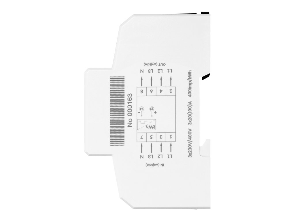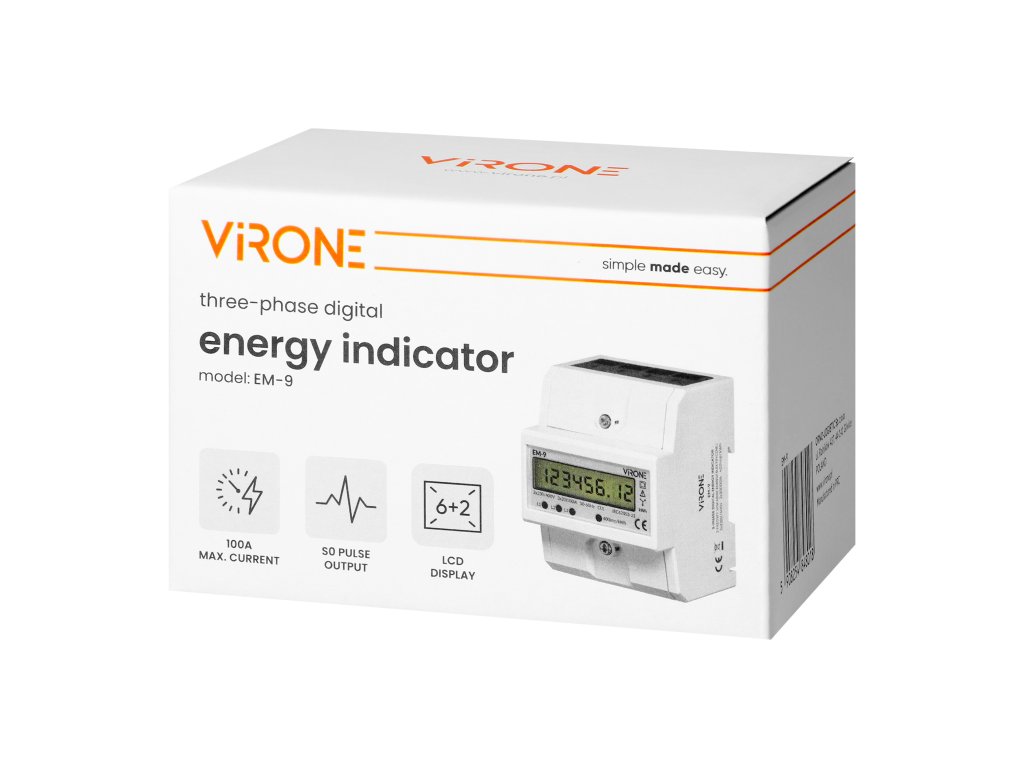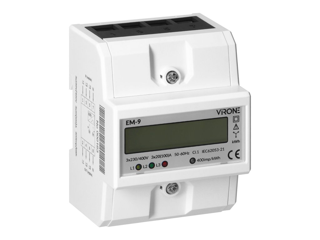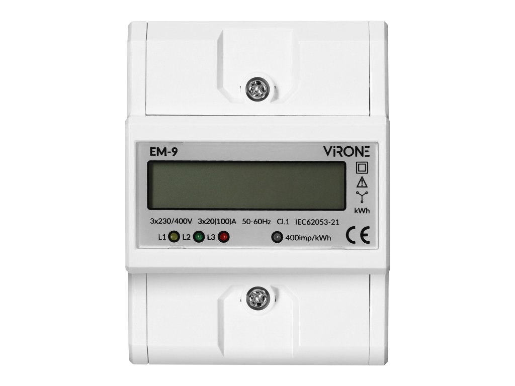 3fázový digitální elektroměr je přesné měřicí zařízení pro monitorování a záznam spotřeby aktivního výkonu v jednofázových obvodech. Měřič je vhodný pro jmenovité napětí 230/400 VAC a jmenovitý proud do 100A. Nízká vlastní spotřeba 2W nebo 10VA ovlivňuje energetickou účinnost instalace.Spotřeba energie v jedné fázi je indikována blikající LED diodou. Počet impulzů je převeden na spotřebovanou energii a její hodnota je zobrazena na LCD displeji (6+2). Navíc je ukazatel vybaven elektrickým impulsním výstupem typu S0, který generuje 400 imp/kWh.