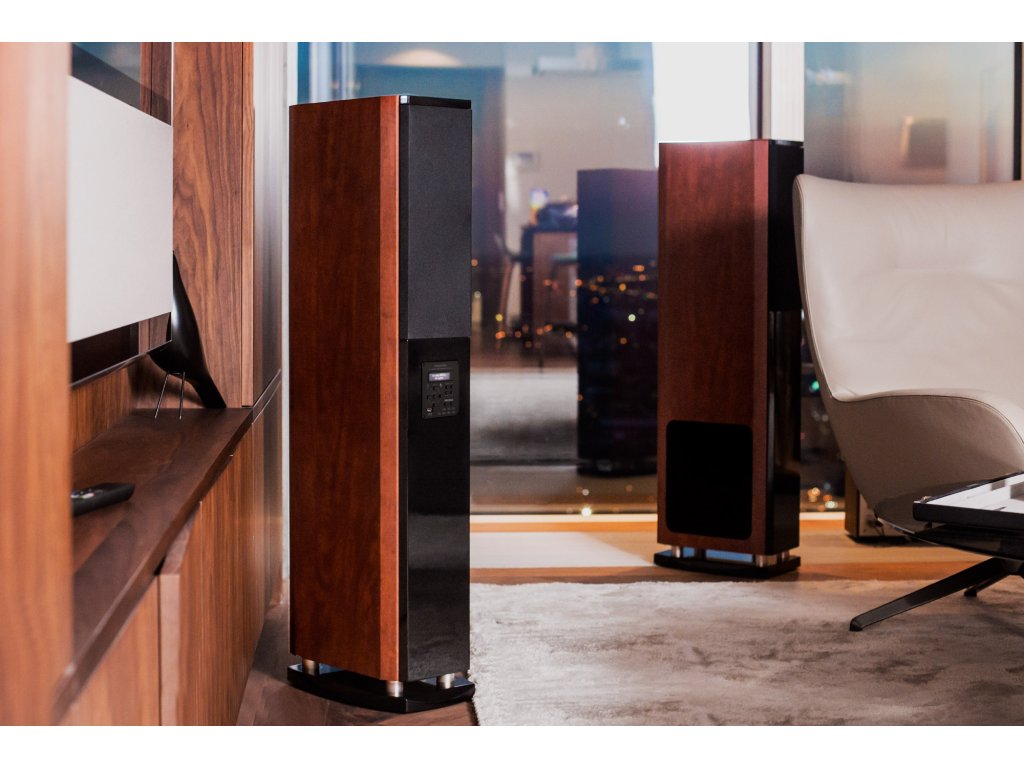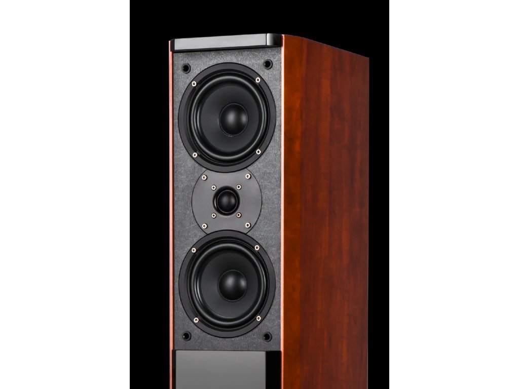 Hluboký a čistý zvuk nejnižších tónů zajišťuje 8palcový basový reproduktor s celulózovou membránou s přenosem od 36 Hz. Velkou výhodou je jeho umístění – převodník je umístěn na boční straně, což pomáhá zachovat štíhlý tvar reproduktorů.