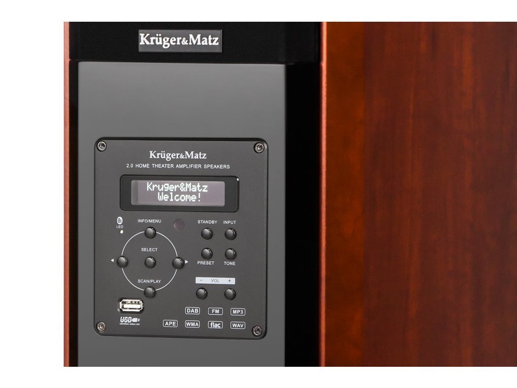 Chcete přehrávat hudbu z jiných zdrojů? Reproduktory Kruger&Matz Passion 2.0 mají několik audio vstupů: RCA, koaxiální, optický, které umožní jejich připojení k televizoru nebo gramofonu. Reproduktory mají také USB port, díky kterému budete moci poslouchat hudbu z flash disku a anténní konektor umožňující poslech FM rádia nebo digitálního rádia DAB+.