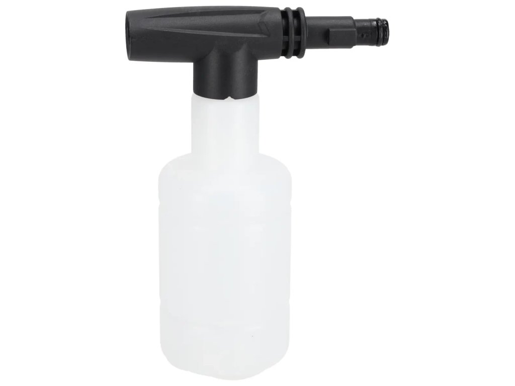 V balení spolu se zařízením najdeme také: hadici na vodu s předfiltrací, podpěrný klip na hadici, trysku, rozstřikovací trysku, pětifunkční trysku, rotační trysku a pěnovač.