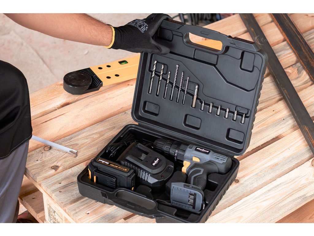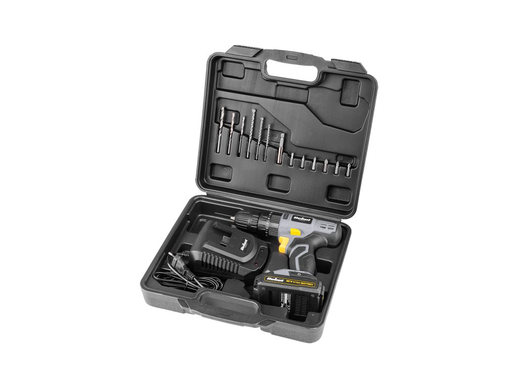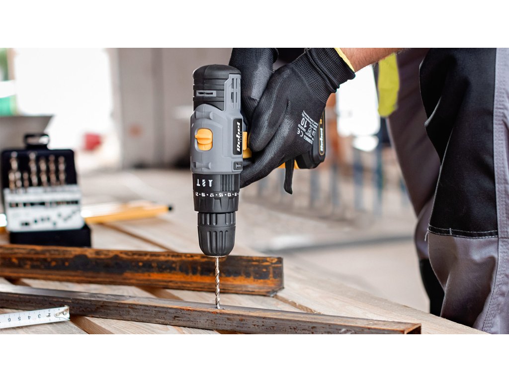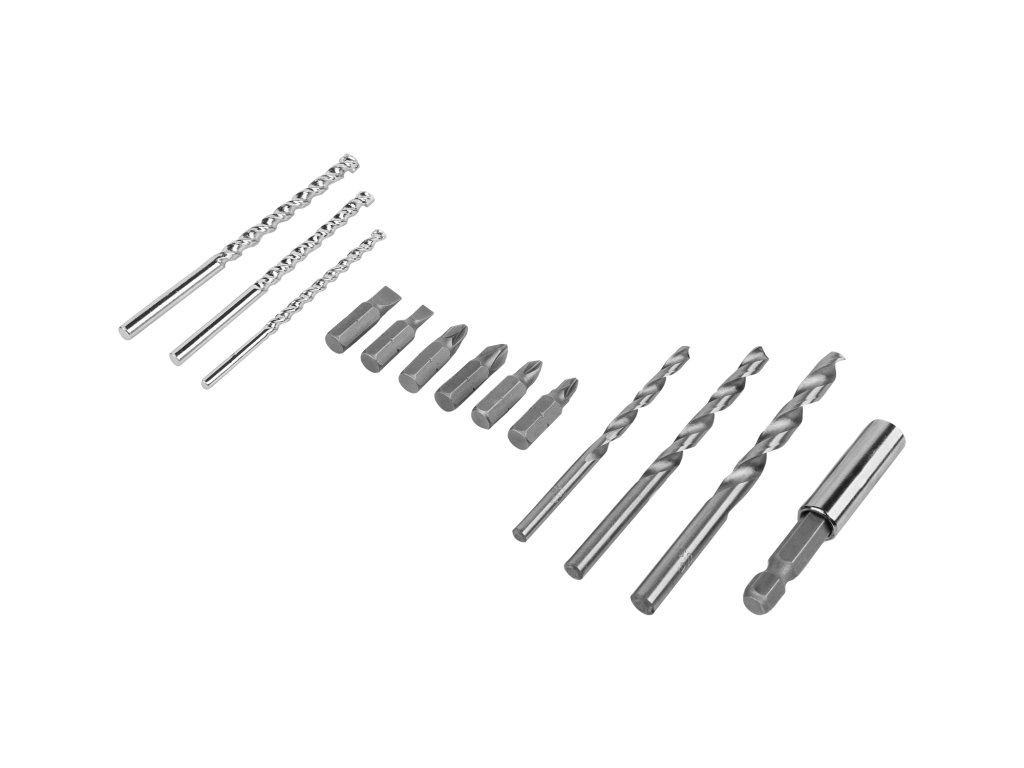 Nástroj navíc disponuje dvěma režimy rychlosti, které zaručují přesnost při práci. Spolu s vrtačkou v sadě je 13 vrtáků, aby bylo možné bez problémů vybrat velikost a typ vhodný k obráběnému materiálu. Výhodou elektrického nářadí je rychloupínací sklíčidlo, díky kterému rychle a pohodlně vyměníte vrtáky – bez použití dalších klíčů.