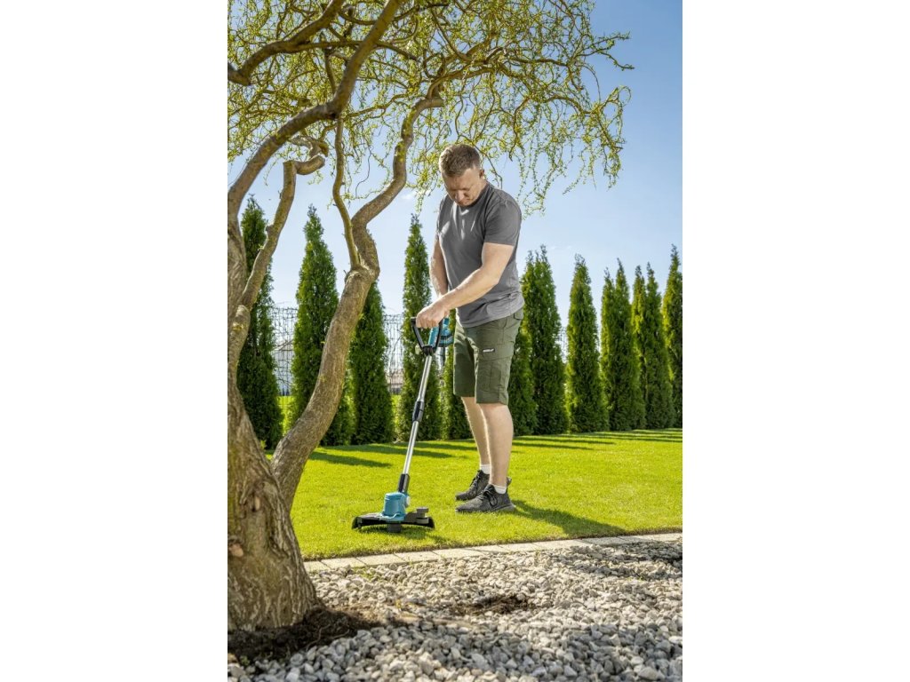 Při každém vypnutí sekačky se struna automaticky vysune o přibližně 1 cm, což zajišťuje připravenost k další práci. Při opětovném zapnutí je přebytek struny zkrácen při prvním otočení zařízení díky malému noži umístěnému na ochraně. Toto řešení eliminuje nutnost ručního nastavení, zrychluje sečení a zvyšuje komfort práce.