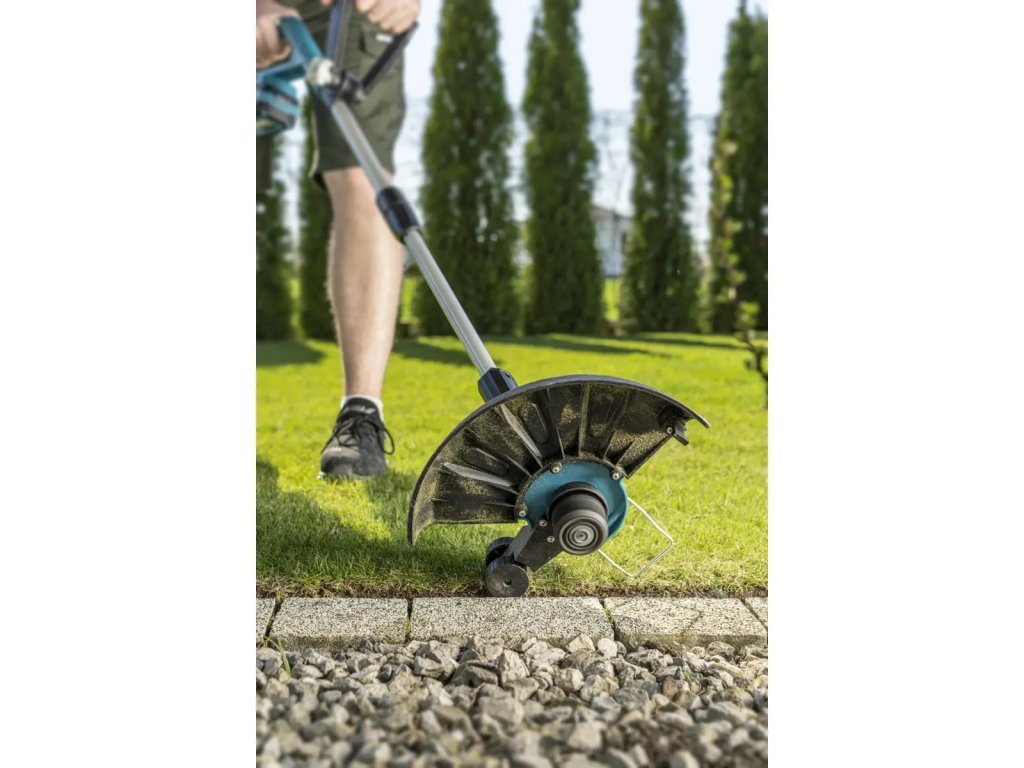 Kovový okrajový omezovač efektivně chrání jemné povrchy, jako jsou květinové záhony nebo okrasné okraje trávníku, a zabraňuje jejich poškození během sečení. Díky němu je možné přesně vést sekačku v blízkosti překážek, což umožňuje přesné zakončení okrajů trávníku. Omezovač zajišťuje plnou kontrolu nad sekačkou, což pomáhá udržovat ideální linii sečení.