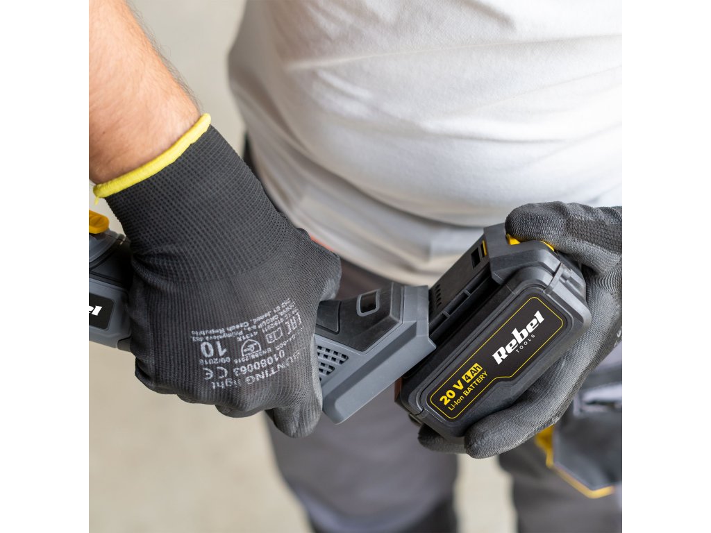 Pro zajištění maximálního komfortu a volnosti práce byl síťový kabel v úhlové brusce Rebel Tool nahrazen možností montáže akumulátoru. K zařízení si můžete dokoupit dostupnou baterii Rebel Tools 4 Ah (model RB-2002), která se vám hodí také pro obsluhu dalších elektronářadí z této série.