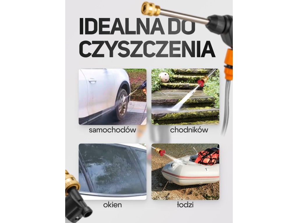 Zařízení je ideální na umyvání aut, motocyklů, bicyklů, a také na čištění teras, zahradního nábytku a nástrojů. Po instalaci rozptylovací trysky ho můžete použít na zalévání zahradních rostlin.