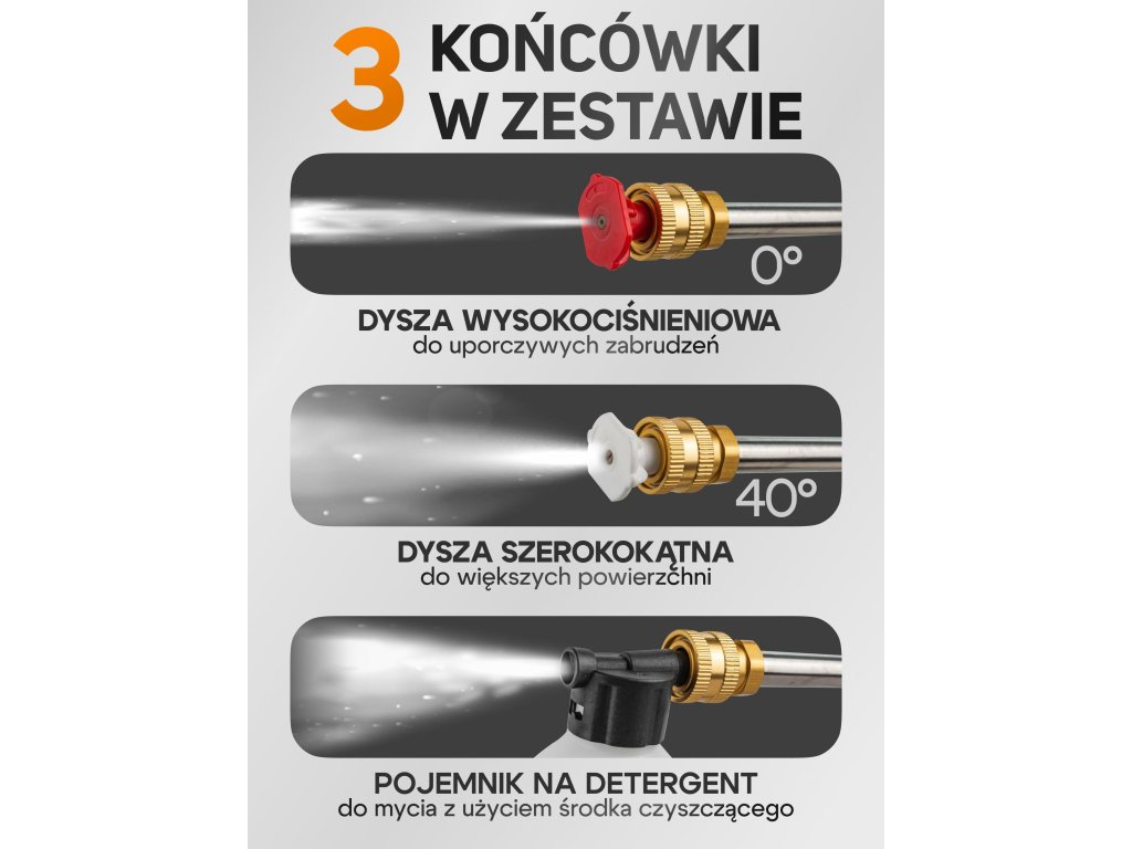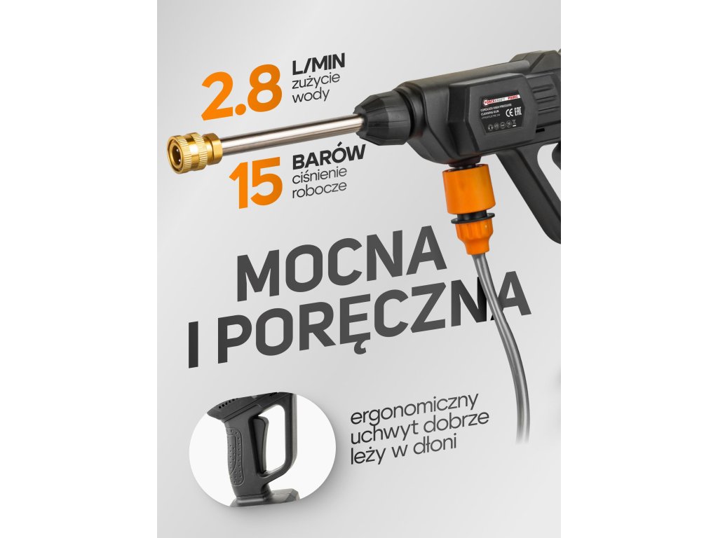 Vybavená kartáčovým motorem a hliníkovým čerpadlem, generuje pracovní tlak 15 bar s výkonem 2,8 l/min, což zajišťuje efektivní odstraňování nečistot s minimálním úsilím. Součástí balení jsou 3 typy trysek, které umožňují přizpůsobit proud vody podle typu čištěného povrchu.