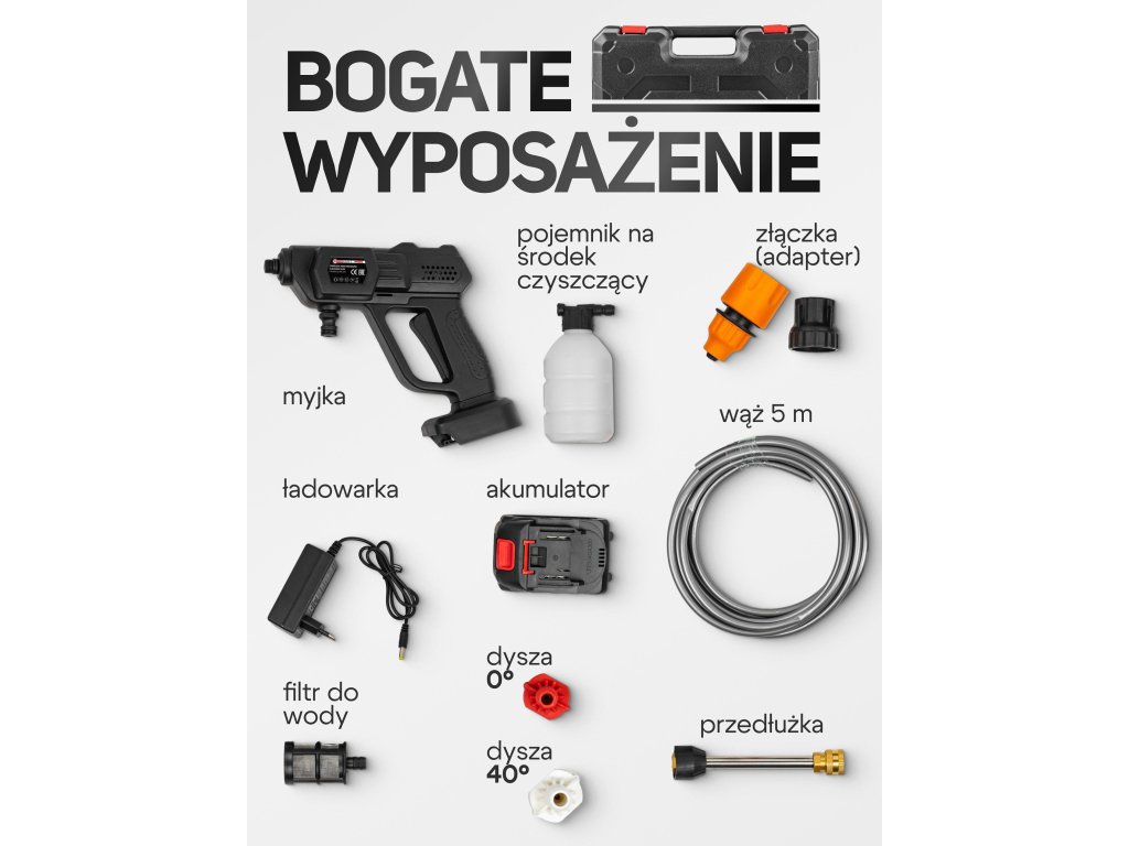 Získáváte multifunkční set – s tryskami, generátorem pěny a baterií, připravený k použití hned po rozbalení.