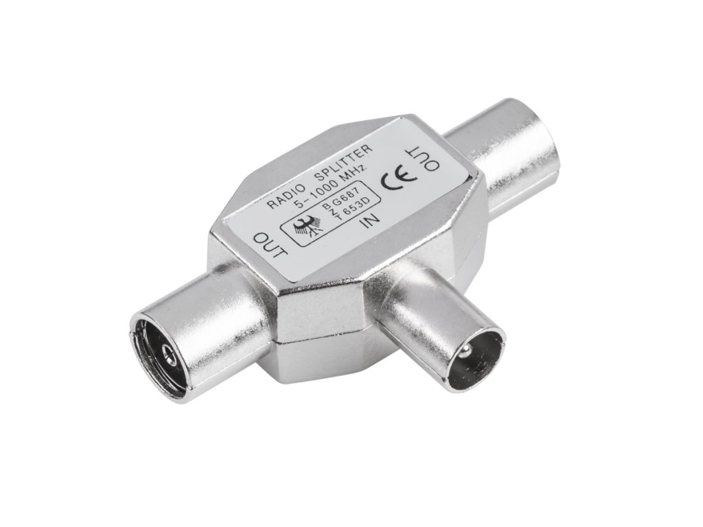 Rozdělovač signálu typu splitter 2-way Pásmo: 5 - 1000 MHz Konektor TV - 2x zásuvky TV, kov Min. objednávka: 25ks.Rozdělovač signálu typu splitter 2-way