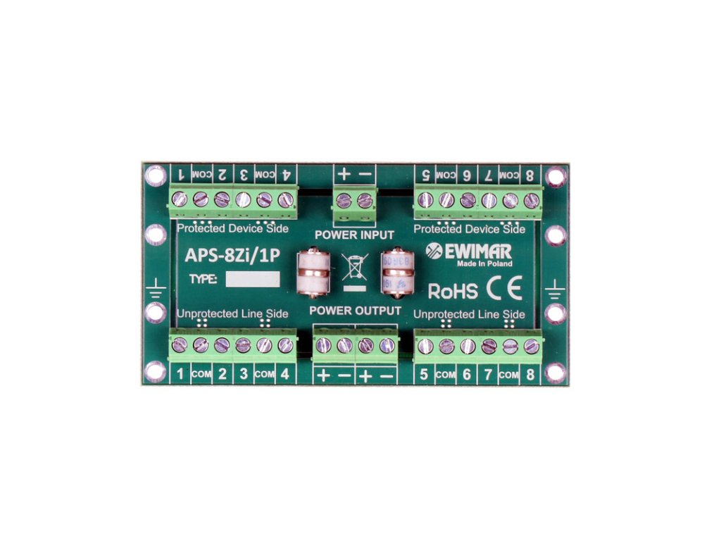 APS-8Zi/1P je modul, jehož úlohou je ochrana ústředen zabezpečovacích systémů před přepětími a atmosférickými výboji. Zařízení je vybaveno 8 ochrannými trasami určenými pro signály alarmových senzorů a jednou společnou ochrannou trasou pro jejich napájení. Ochranník je vyroben formou modulu, instalovaného ve speciální skříni spolu s dalšími moduly, které mohou vytvořit komplexní ochranný systém pro všechny signály ústředny zabezpečovacího systému. Ochrana eliminuje výskyt přepětí indukovaných v alarmových kabelech během atmosférické bouře. APS-8Zi/1P využívá speciální řešení, díky nimž #odstraňuje skoky jisker, které se snaží proniknout do zabezpečovacího systému z jiných instalací a odvádějí elektrický náboj do země. Zařízení je určeno k použití se senzory instalovanými uvnitř budovy.