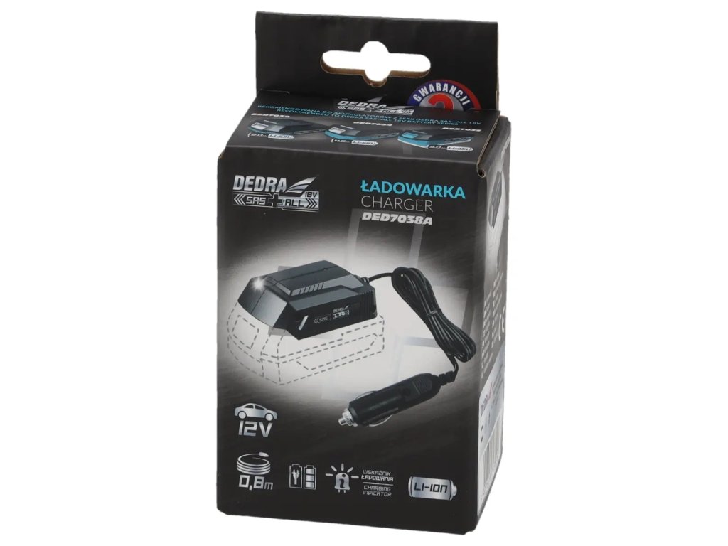Tento výrobek je určen k nabíjení baterií řady SAS+ALL (DED7032, DED7034, DED7035, DED6936, DED6937). Tato nabíječka do auta doplňuje již tak rozsáhlý sortiment nabíječek v řadě SAS+ALL (DED7038, DED7039, DED7038V, DED7039V). Autonabíječka DED7038A nabije 2,0 Ah baterii za 70 minut, 4,0 Ah baterii za 140 minut a 5 Ah baterii za 160 minut. Nabíječka DED7038A umožňuje nabíjení baterie prostřednictvím 12V zásuvky, což je ideální pro cestování do práce a z práce, aby byl stroj připraven k použití ihned po příjezdu. Nabíječka je vybavena LED diodou: ta indikuje, kdy je nabíječka připojena k napájení a kdy je proces nabíjení baterie ukončen.