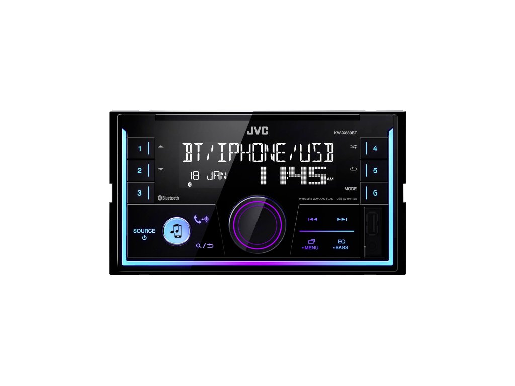 Bezdrátová technologie Bluetooth (dostupné funkce závisí na modelu telefonu) Připojení Bluetooth Hands Free Call (HFP) Možnost připojení přes Bluetooth 2 telefonů Bluetooth Audio Streaming & Control (A2DP, AVRCP) JVC Streaming DJ (možnost připojení až 5 zařízení Bluetooth). Funkce hlasového volání přes Bluetooth (vyžadován mobilní telefon kompatibilní s rozpoznáváním hlasu) Profil přístupu k telefonnímu seznamu Bluetooth (PBAP) Automatické párování Bluetooth iPhone a Android Přehrávání hudby z iPodu/iPhonu Ovládání Spotify (Android přes Bluetooth, iPhone přes USB nebo Bluetooth) USB High Current 1.5A Charging Aplikace JVC dálkového ovládání AAC Compatible FLAC kompatibilní s tagy (až 96kHz/24bit) Variabilní barva podsvícení 2-řádkový LCD displej 13-pásmový grafický ekvalizér 11 nastavení ekvalizéru Technologie K2 (originální technologie JVCKenwood obnovuje originální zvuk díky konverzi frekvenčního rozsahu a přenosu bitů). Vyrovnávání času Space Enhancement Sound Response Sound Lift Volume Link EQ Možnost spolupráce s továrním ovládáním audia Variabilní barva podsvícení 2 RCA Preouts, 2.5V (Front - Rear/SUB) Rear/Sub přepínatelnéBezdrátová technologie Bluetooth (dostupné funkce závisí na modelu telefonu)