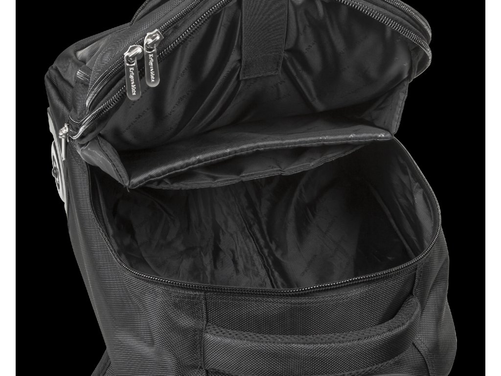 Batoh Kruger&Matz je velmi prostorný a má mnoho praktických řešení, díky nimž najdeš místo na všechny potřebné věci. Na přední straně jsou umístěny dvě praktické kapsy na telefon, peněženku a další drobné předměty. Hlavní komora je rozdělena na dvě přihrádky. V jedné z nich bude tvůj notebook pohodlně uložený a tím skvěle chráněný před možným poškozením. Do druhé si můžeš uložit diář a nezbytné dokumenty. V téže části batohu na jedné z bočních stěn najdeš místo na myš, sluchátka nebo další příslušenství.