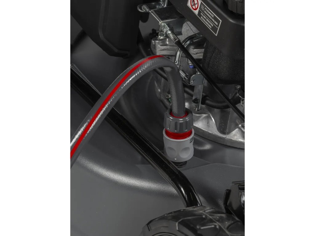Pro větší pohodlí a funkčnost byla sekačka vybavena funkcí mytí krytu – stačí připojit zahradní hadici a točící se nůž rozptýlí vodu, čímž vyčistí vnitřní prvky zařízení.