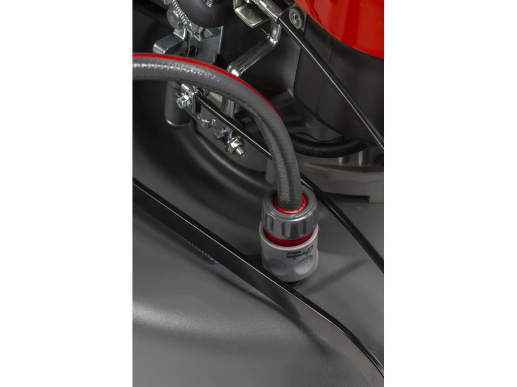 Kromě toho má sekačka funkci mytí krytu - zahradní hadici můžeme připojit k tělu sekačky pomocí vnitřní rychlospojky - vnější vývod je na krytu sekačky. Při zapnutém motoru otočíme kohoutkem a voda se přes hadici přivádí do vnitřku těla a nůž svou rotační silou rozvádí vodu a "umyje" sekačku zespodu - tam, kde je nejvíce zaschlé nakupené trávy.