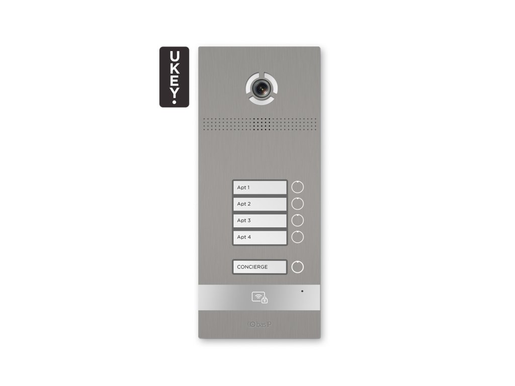 Venkovní panel BI-04FB Silver značky BasIP je určen pro instalaci videovrátnika v technologii IP. Panel má 4 tlačítka pro účastníky a 1 tlačítko typu "Concierge". BI-04FB se vyznačuje moderním designem a širokou funkčností; je vybaven bezkontaktní čtečkou ve standardech Mifare a Unique a je plně integrován se systémem otevírání UKEY (QR kód, NFC a Bluetooth BLE). Zařízení má možnost úplné integrace s jakýmikoli bezpečnostními a automatizačními systémy přes otevřené rozhraní API.