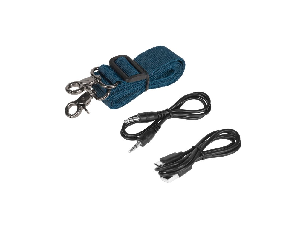 V balení: USB-C kabel (75 cm), AUX kabel 3,5 mm (53 cm), popruh, návod k použití