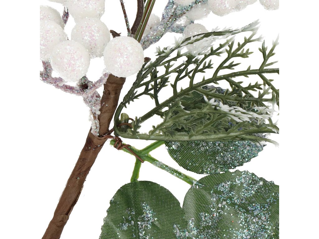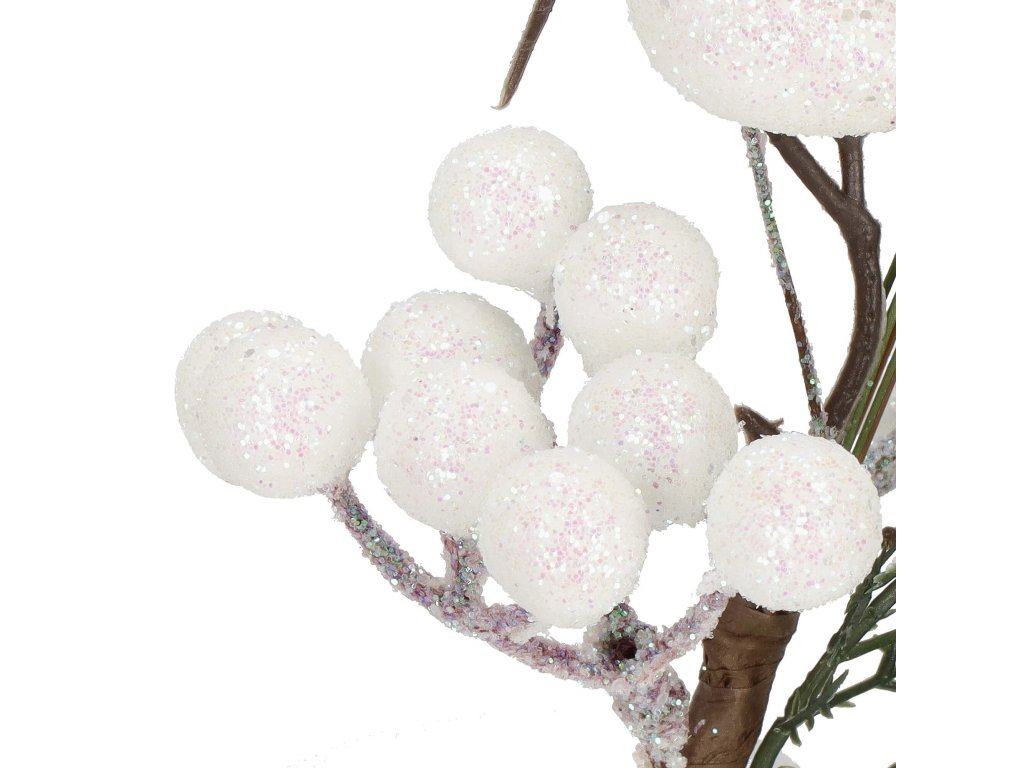 - Větvička obsahuje: bílé kuličky (jeřabina), umělé listy a větvičky, třpytivý ptáček