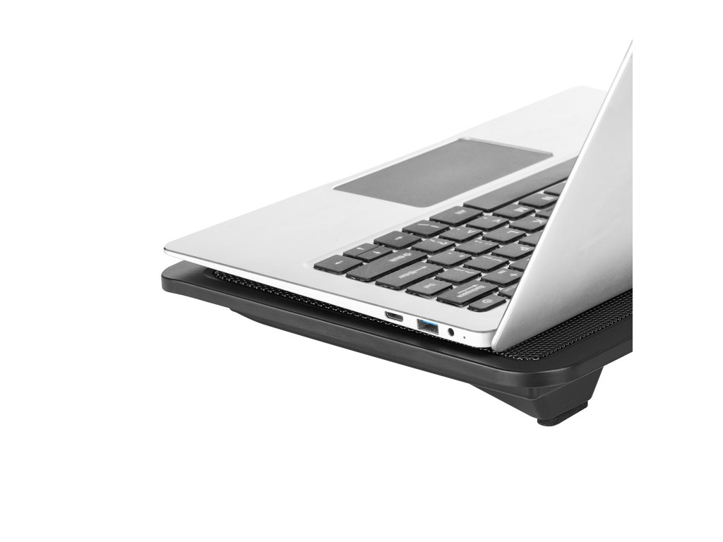 Podložka pod notebook s ventilátorem o průměru 125 mm se vyznačuje velmi tichým provozem – úroveň hluku je jen 10 dB. Důležité je, že tento doplněk je vybaven portem USB, takže přestože je napájen z USB, nesníží funkčnost vašeho notebooku. Chladicí podložka ze série Rebel nejen prodlouží životnost vašeho počítače, ale také bude představovat skvělé estetické vybavení vaší kanceláře. Černá, štíhlá konstrukce byla doplněna o modré podsvícení ventilátoru, které dodá podložce moderní vzhled.