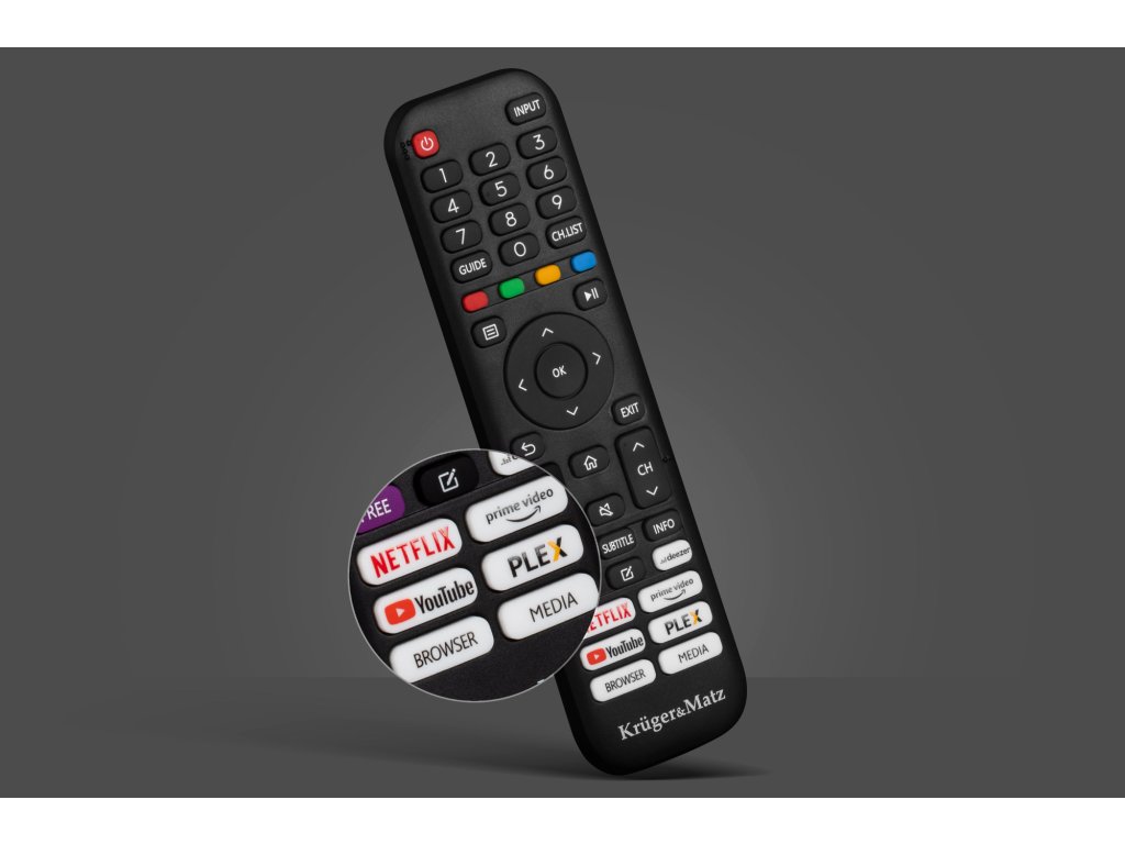 Dálkový ovladač dodávaný k televizoru Kruger&Matz byl navržen s ohledem na pohodlné a intuitivní používání. Na ovladači jsou zkratky k nejoblíbenějším aplikacím, jako jsou Netflix, YouTube nebo Amazon Prime Video. Díky nim můžete rychle spustit oblíbený obsah bez nutnosti procházet menu nebo hledat aplikace.