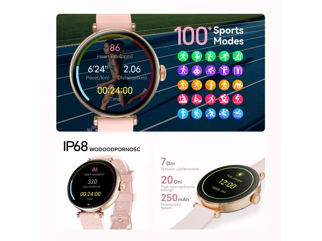 Funkce: Monitor spánku, krokoměr, počítadlo spálených kalorií, měření okysličení krve, správa hovorů, správa hudby, notifikace z telefonu, budík, upozornění na nečinnost, stopky, časovač, počasí