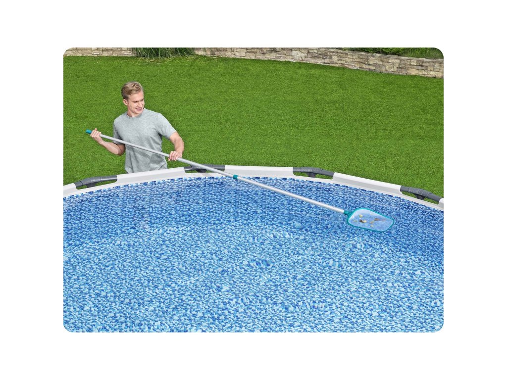 Součástí této sady je hliníková teleskopická tyč s maximální délkou 279 cm, díky čemuž bez problémů vyčistíte i větší bazény.