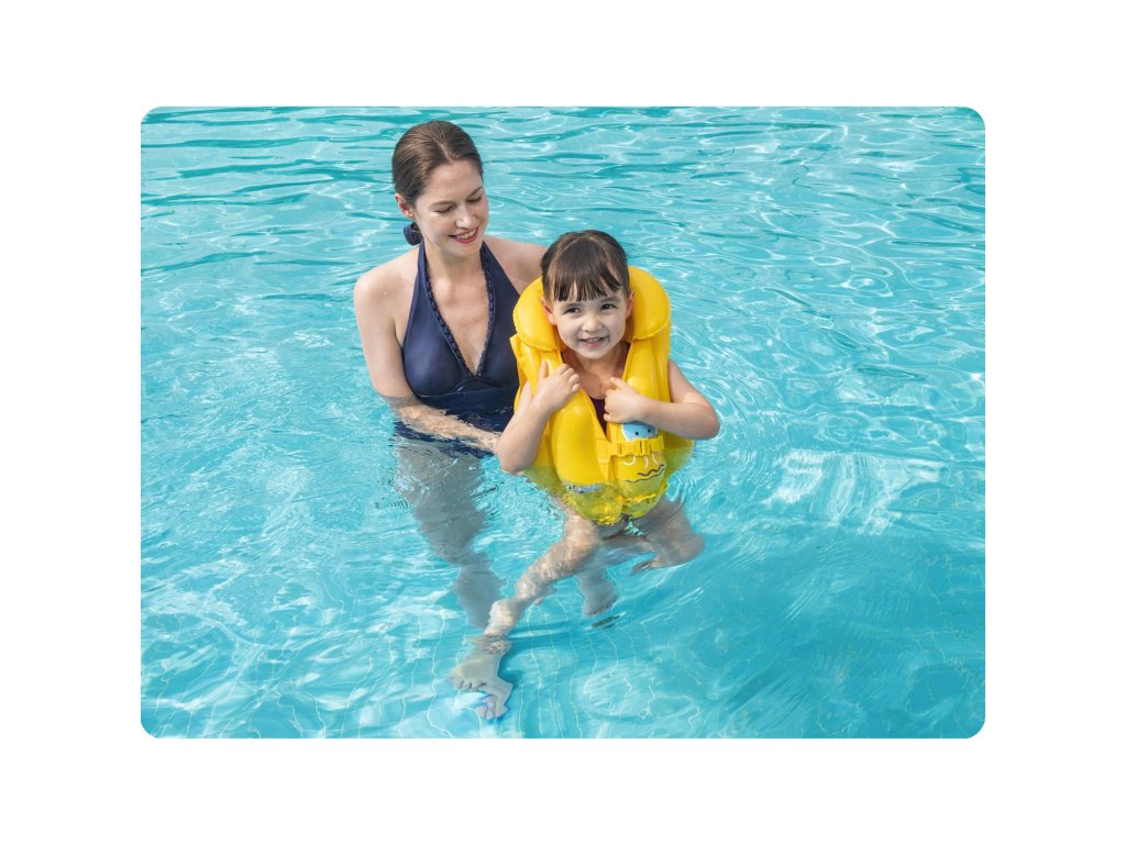 Vesta o rozměrech 51 cm x 46 cm, při dohledu dospělé osoby, poskytuje malým plavcům úplnou bezpečnost. Tři nezávislé vzduchové komory udržují dítě na hladině a nafukovací límec brání ponoření hlavy do vody. Vesta je zapínána na dvě nastavitelné přezky, takže dítě z ní samo nevypadne. Navíc žlutá barva umožní ti rychle najít své dítě v davu plážových návštěvníků.