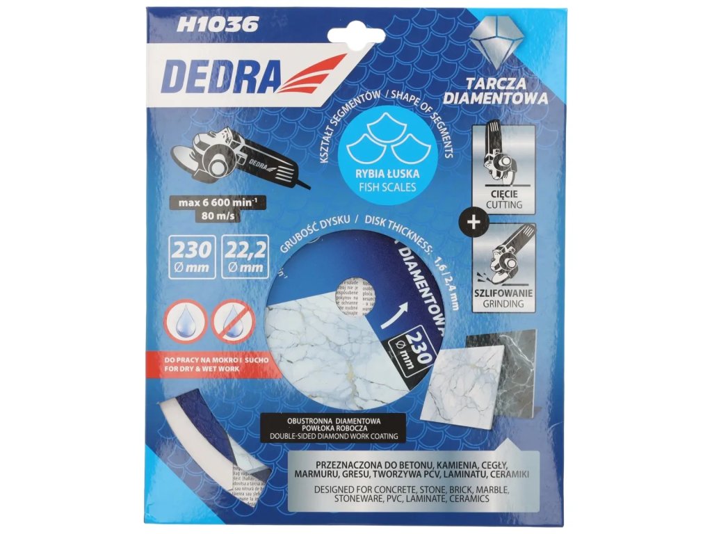 Diamantový kotouč se segmentem typu šupina DEDRA H1036 je určen k mokrému a suchému řezání, výborně si poradí s obráběním různých materiálů.