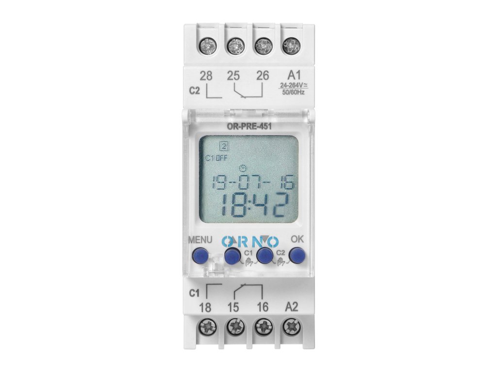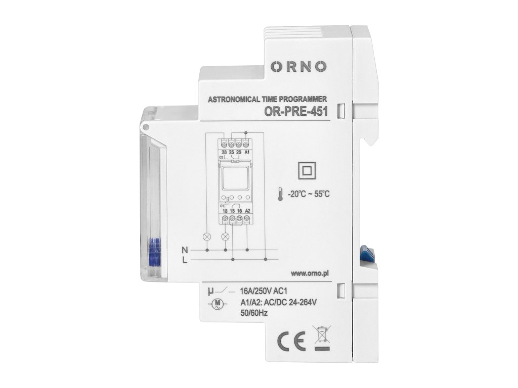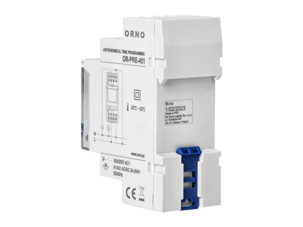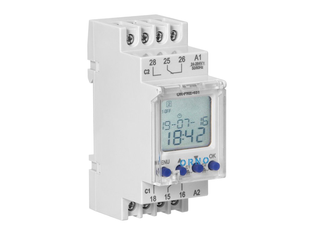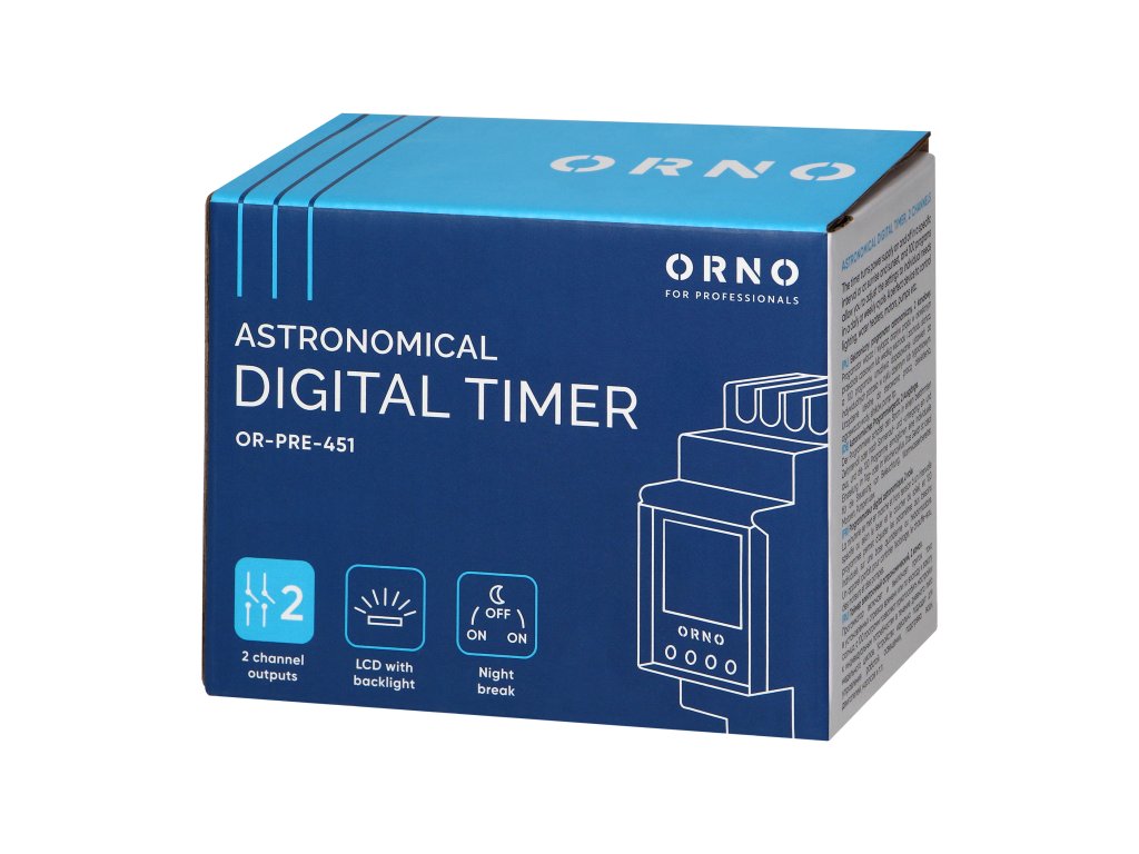Tento multifunkční časovač umožňuje šetřit elektrickou energii a usnadňuje používání různých elektrických zařízení. Zabudovaný orloj vypočítává časy východu a západu slunce v rámci definované geografické oblasti a časového pásma. Tento časovač zapíná a vypíná napájení ve stanoveném čase a 100 spínacích bodů vám umožňuje přizpůsobit nastavení vašim individuálním potřebám. Typy programů: týdenní, roční a astronomické. Provozní režimy: manuální, automatický, dovolenkový, náhodný. Zařízení je ideální pro ovládání chodu osvětlení, ohřívačů vody, motorů, čerpadel atd. Má zabudovanou baterii, která při výpadku proudu udrží nastavení hodin.