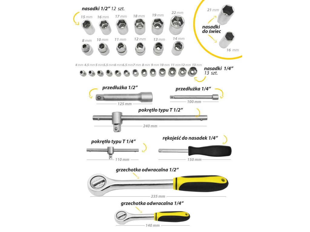 - Nástavce 1/4" – 13 ks: 4 mm, 4.5 mm, 5 mm, 5.5 mm, 6 mm, 6.5 mm, 7 mm, 8 mm, 9 mm, 10 mm, 11 mm, 12 mm, 13 mm