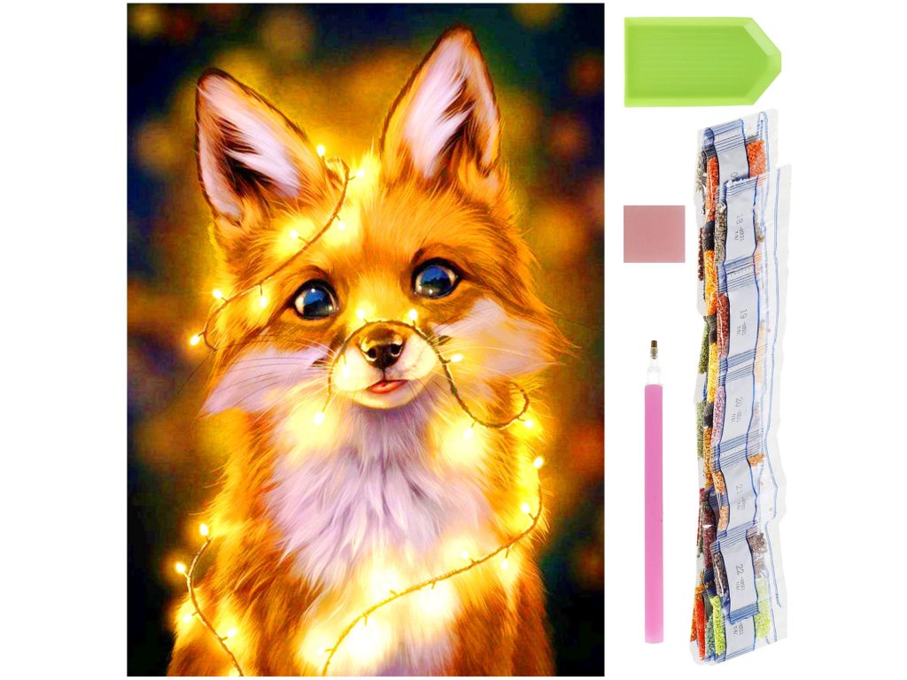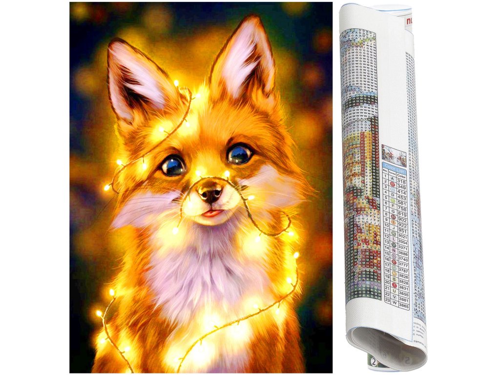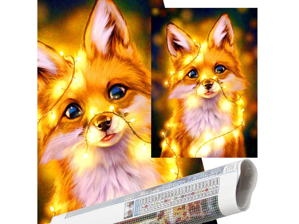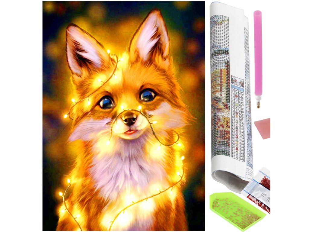 1x silné plátno s potištěným obrazem, který zobrazuje malou lišku a index přiřazující písmena k barvám a barvy k číslům určujícím barvu diamantu