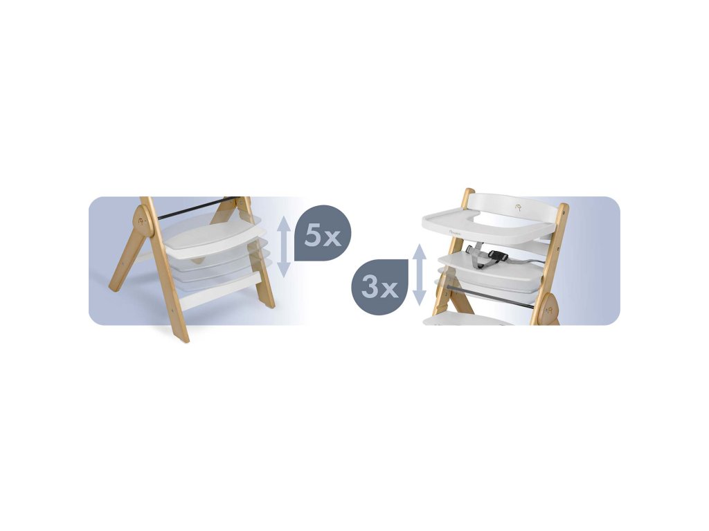 Když vaše dítě roste, židlička se vyvíjí! Stačí sundat tácek a přizpůsobit výšku sedáku a opěrky na nohy a židlička se mění v ideální místo pro jídlo u rodinného stolu. Stabilní, ergonomické a vždy ve správné výšce.