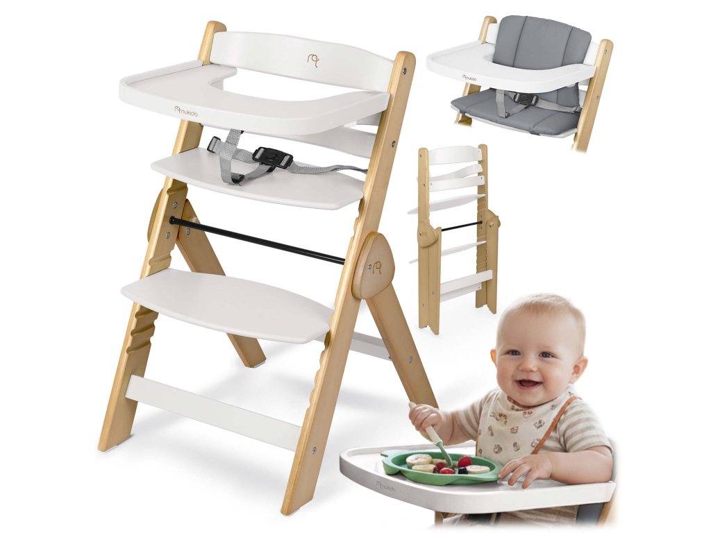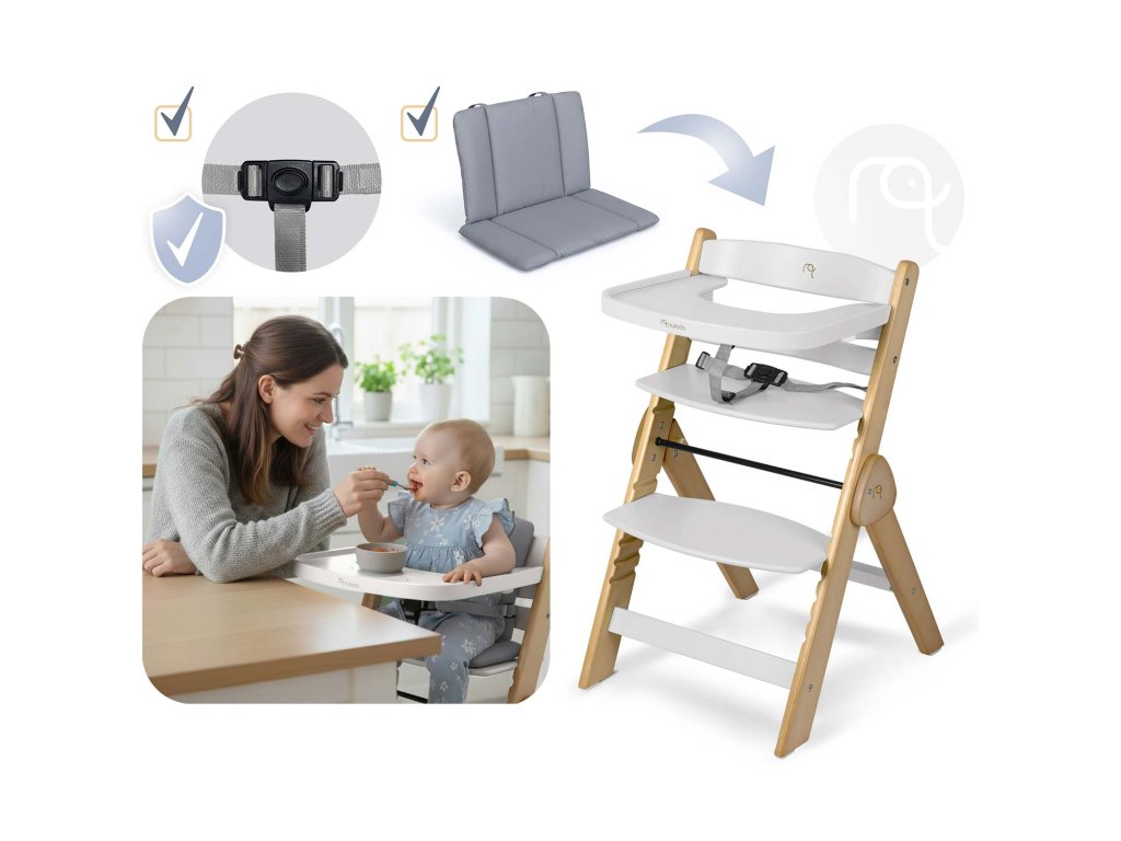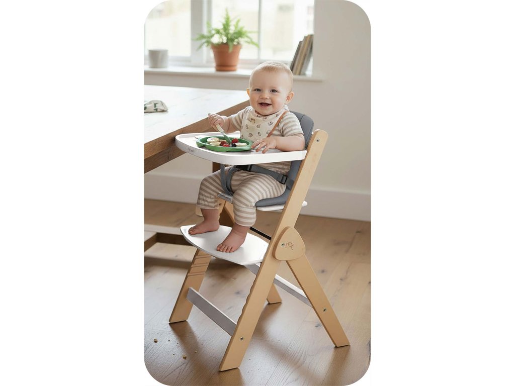 Díky speciálnímu setu s bezpečnostními pásy a pohodlným polštářem se stává bezpečnou a komfortní první židličkou pro vaše miminko. Ideální na první jídla a společné chvíle u stolu.