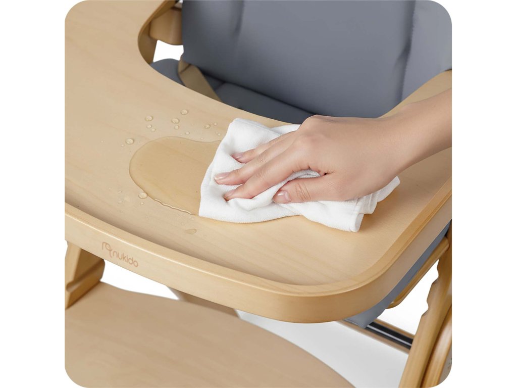 Odnímatelný tác výrazně usnadňuje udržování čistoty. Lakované topolové dřevo je zárukou kvality. Ošetřené dřevo nepovolí nasáknout skvrny a židlička se rychle vrátí ke skvělé čistotě.