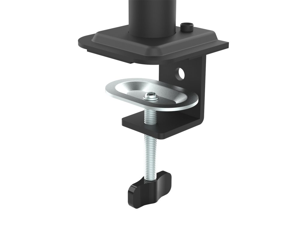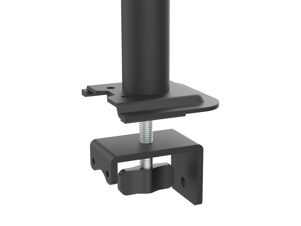 Upevnění na hranu desky nebo přes otvor umožňuje uvolnit pracovní prostor, a odnímatelná deska VESA usnadňuje rychlou montáž monitoru. Získáte volnost a pořádek, eliminujte nutnost postavení stojanu monitoru. Toto praktické řešení podporuje ergonomii a stará se o pohodlí uživatele během dlouhých hodin u počítače.
