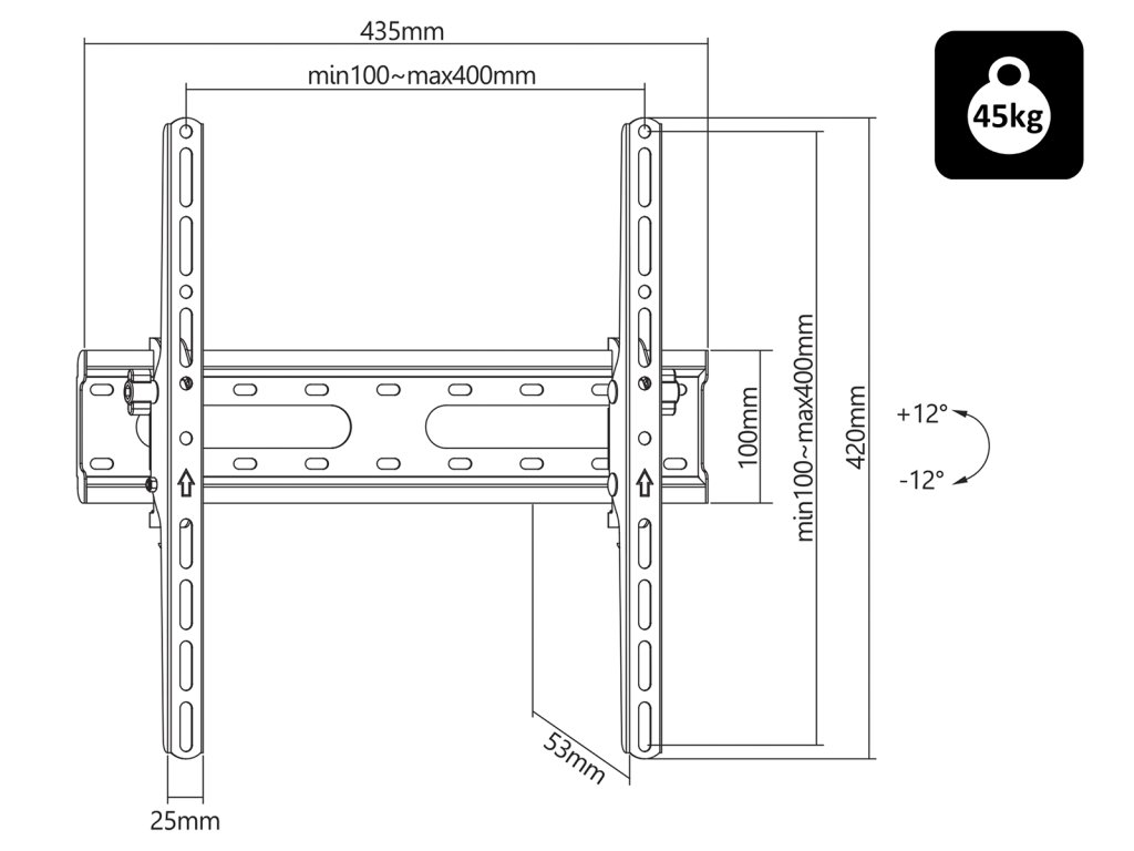 Použitý nejpopulárnější standard VESA umožňuje nainstalovat prakticky každý televizor vybavený otvory o rozteči 75 x 75, 100 x 100, 100 x 150, 100 x 200, 150 x 100, 150 x 150, 200 x 100, 200 x 200, 300 x 200, 300 x 300, 400 x 200, 400 x 300, 400 x 400 a hmotnosti nepřesahující 45 kg.