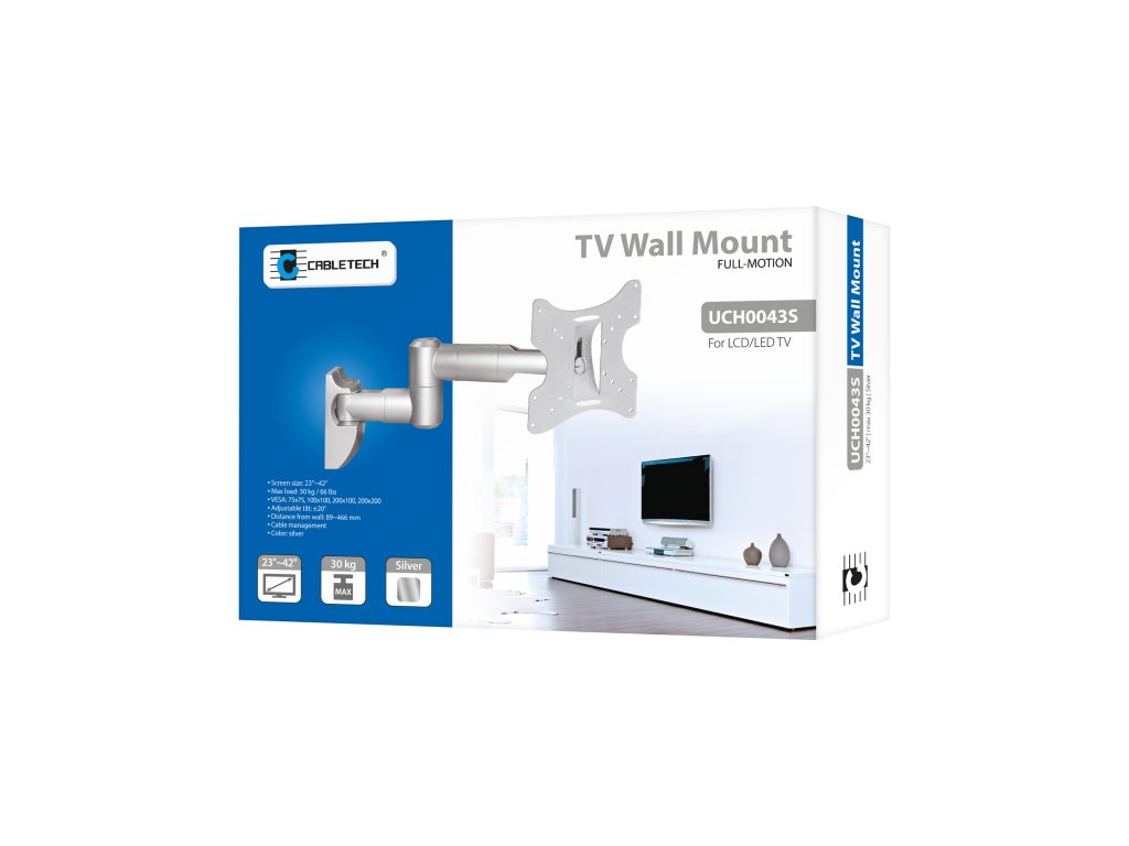 Držák podporuje širokou škálu standardů VESA a je přizpůsoben pro televizory o maximální hmotnosti 30 kg, což zajišťuje stabilitu. Nastavení vzdálenosti od zdi v rozmezí od 89 do 466 mm a vestavěné řízení kabelů umožňují estetické a funkční přizpůsobení. V balení jsou přiloženy montážní šrouby, což usnadňuje rychlou a snadnou montáž.