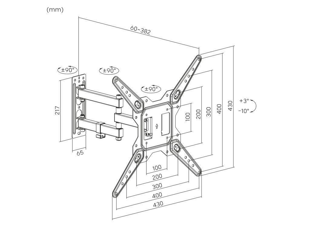 Standard VESA: 100x100, 100x200, 200x100, 200x200, 300x200, 400x200, 300x300, 400x300, 400x400