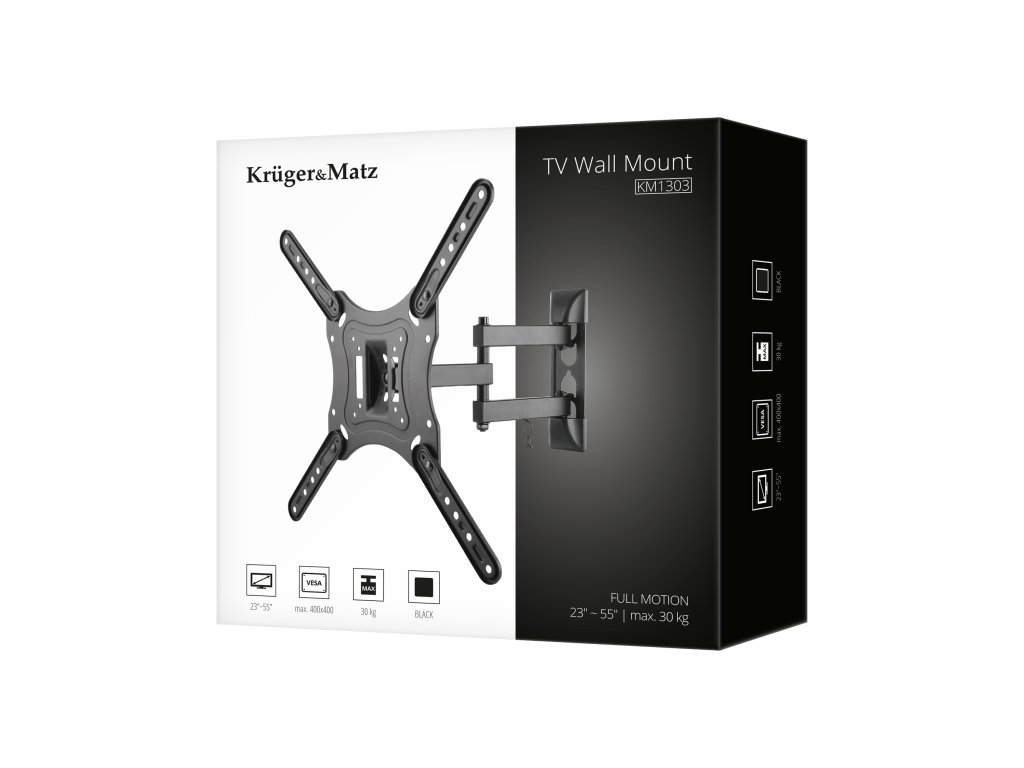 V moderním interiéru je stejně důležité jako samotný nábytek jejich správné uspořádání. Pokud chcete zařídit svůj obývací pokoj v minimalistickém stylu, skvělým rozhodnutím bude zavěšení televizoru na stěnu. Pohyblivý držák Kruger&Matz KM1303 vám umožní namontovat zařízení o velikosti od 23’’ do 55’’ a hmotnosti 30 kg, a široký rozsah nastavení ve vertikálním a horizontálním směru zaručuje vysoký komfort používání televizoru.