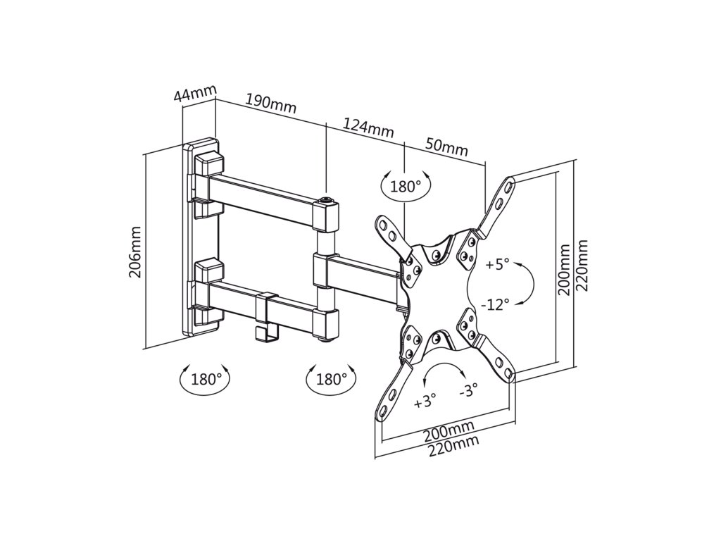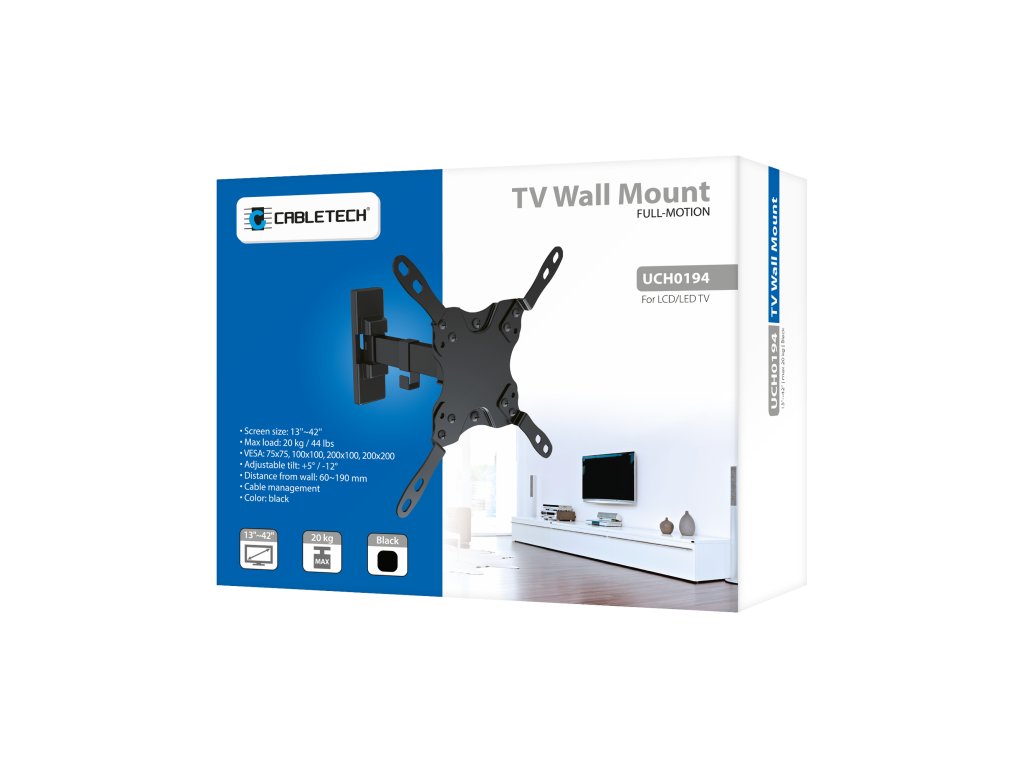 Univerzální nástěnný držák pro LED TV (13-42") je vynikajícím řešením pro LCD televizory od 13 do 42 palců a s maximální nosností 20 kg. Díky pohyblivé konstrukci umožňuje nastavení ve vertikálním směru od +5° do -12° a v horizontálním směru od +90° do -90°, což umožňuje plné přizpůsobení úhlu pohledu a zajišťuje komfort při sledování z jakéhokoli místa v místnosti.