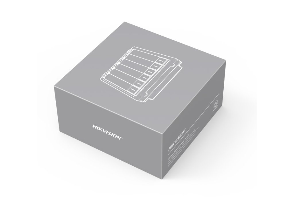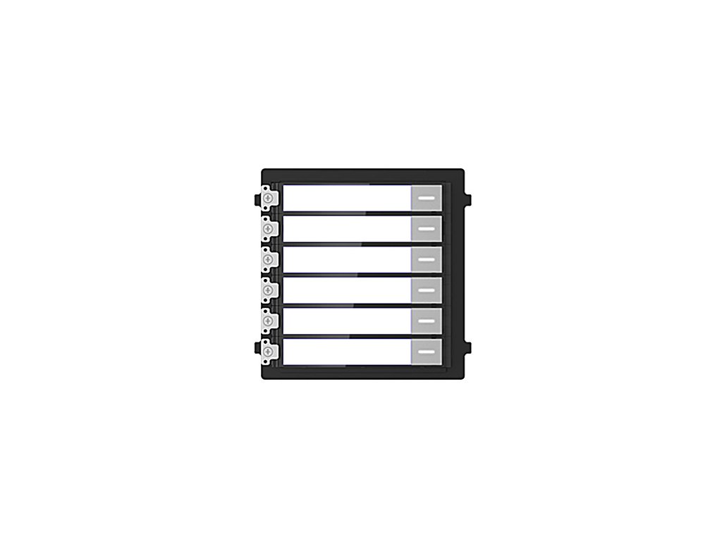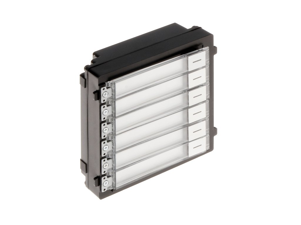 Hikvision.Panel telefonního seznamu je postaven ze šesti mechanických tlačítek vyvolání a stejného počtu popisných polí. Modul telefonního seznamu DS-KD-KK umožňuje vyvolání účastníka a realizaci audio a video hovorů s jakýmkoliv uživatelem v dosahu systému videovrátník.