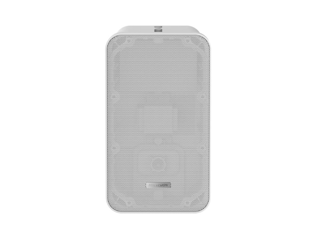 DS-QAE0420G1-V je analogový dvojpásmový nástěnný reproduktor od společnosti Hikvision. Jeho jmenovitý výkon je 20W, zaručuje velkou vzdálenost přenosu a vysokou kvalitu zvuku. Jeho kryt má stupeň ochrany IP66, který zajišťuje odolnost vůči povětrnostním vlivům a umožňuje venkovní montáž. Díky držákům ve tvaru písmene L máme možnost nastavit úhel jejich montáže. Další výhodou je zabudovaný transformátor s amplitúdou 100V, který umožňuje sériové připojení více reproduktorů.