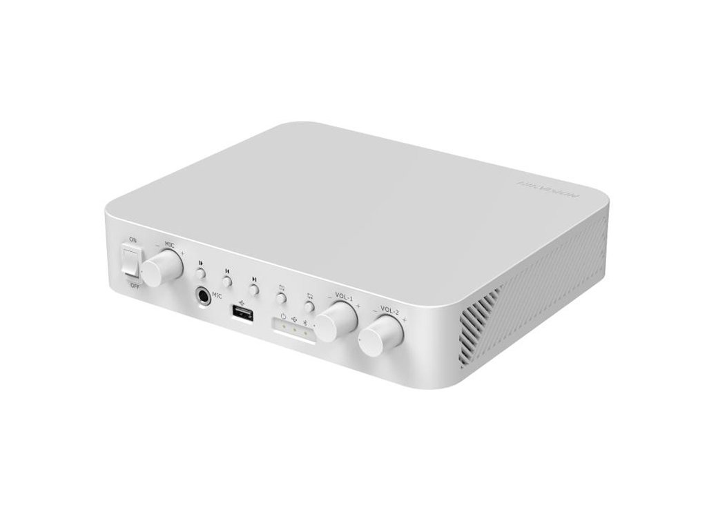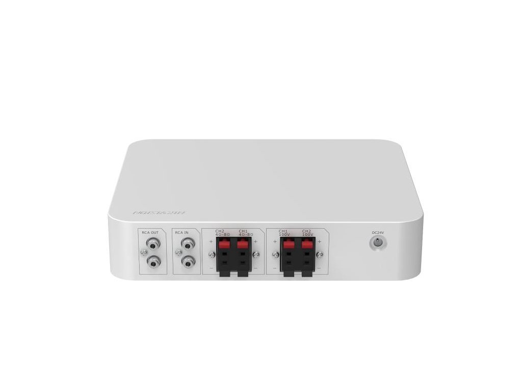 DS-QAE0A60G1-VB je analogový audio zesilovač společnosti Hikvision. Zesilovač má možnost výběru různých zdrojů zvuku, přes Bluetooth, port USB 2.0, vstupy RCA a mikrofonní vstup. Můžete k němu připojit reproduktory s impedancí 4 (2x 30W), 8 (2x 15W), jakož i 100V reproduktory s možností vytvoření 2 zón s nezávislým ovládáním hlasitosti.
