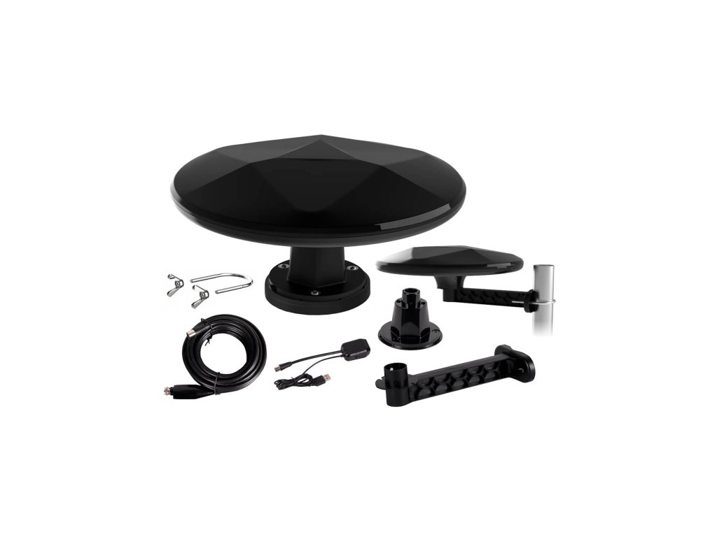 ---------- Technické údaje ---------- Rozsah: 174 MHz - 230 MHz (VHF), 470 MHz - 698 MHz (UHF) Zisk: 35 dB Výstupní úroveň signálu (max.): 115 dBuV Úroveň šumu: <3,5 dB Napájení: 5 V, anténní Směrování: 360° Uchycení: Magnetický držák / Boční držák / Stálá základna Filtr: LTE/4G/5G Délka kabelu: 6 m Rozměry antény: 33 cm (průměr) x 17 cm (Výška s magnetickým podstavcem) Rozměry balení: 45 x 12,5 x 36 cm Hmotnost balení: 2,5 kg V sadě: Anténa, stálý držák, boční držák, magnet, kabel o délce 6 m, separátor napětí s napájecím kabelem USB, návod ---------- Vlastnosti ---------- Napájení USB nebo z televizní antény Velmi dobrý příjem signálu DVB-T/T2 na vzdálenost až 120 km od vysílače Možnost příjmu všech MUX-ů (včetně MUX-8) Tři varianty montáže (magnetická základna, boční držák, stálá základna) Vestavěný filtr LTE/4G/5G Odolné pouzdro a solidní zpracování Povlak odolný proti UV záření----------