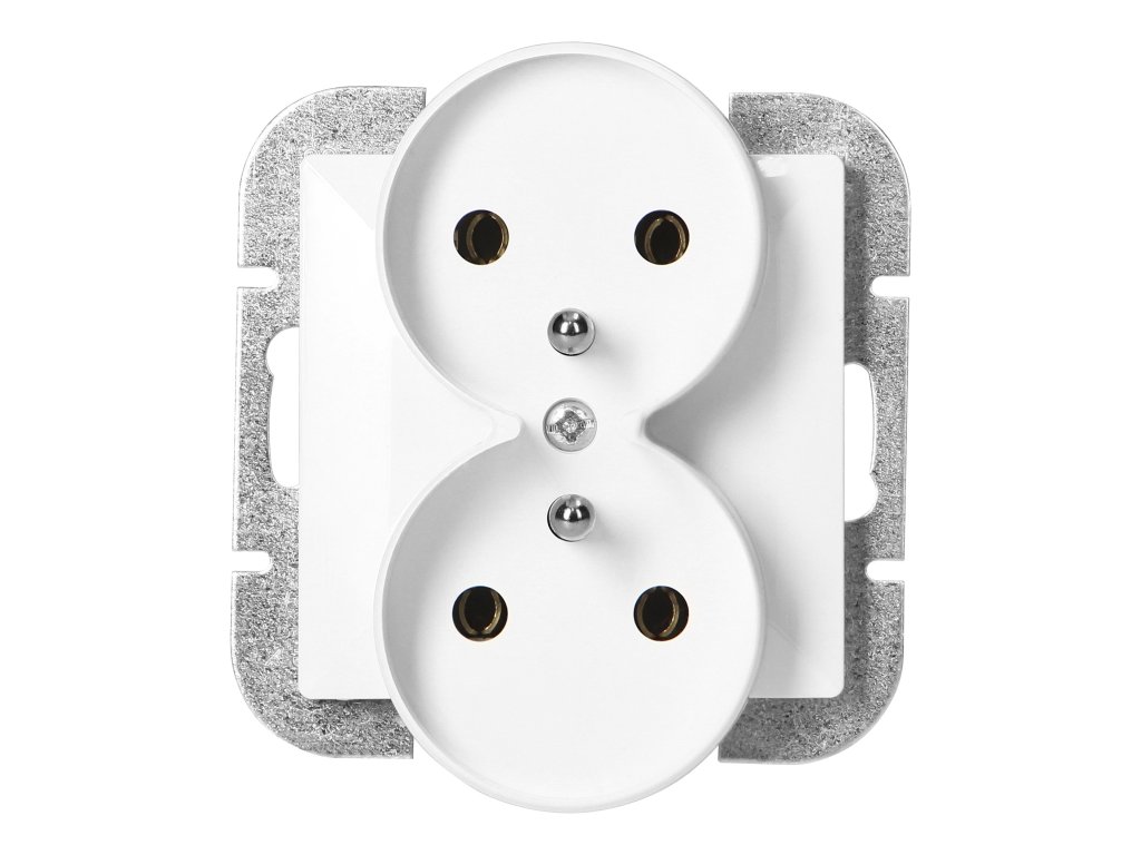 Modulární řada se symetrickou systémovou rámovou deskou (pro 1-, 2-, 3-, 4-, 5-modulů) umožňující montáž produktu v horizontální i vertikální poloze. Moderní rychlospojovací mechanismus (vodiče se připojují přímo zatlačením do těla) poskytuje bezpečnou a spolehlivou instalaci a odstranění vodičů. Zásuvky jsou vybaveny tradičními šroubovými připojeními. Vnitřní konstrukce svorek zaručuje bezpečné připojení vodičů od 0,75 mm? do 2,5 mm?. Silná a robustní montážní deska mřížky a vysoce kvalitní samovratné prvky umožňují stabilní a bezpečnou instalaci do krabice. Speciální pružicí prvky usnadňují usazení rámu do těla.Dvojitá francouzská zásuvka, 2x2P+E. Navržena pro zapuštěnou montáž v systému rámové desky. Je určena pro použití v interiéru (IP20).