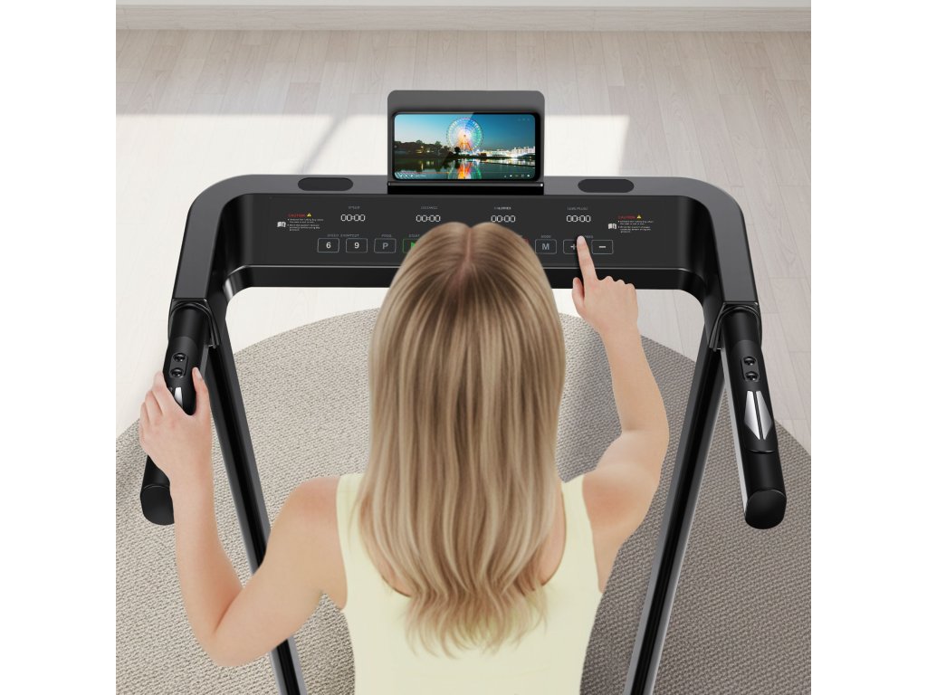 Vestavěný držák na telefon nebo tablet umožňuje při běhu vychutnávat oblíbenou hudbu nebo seriály. To je ideální spojení zábavy a aktivity – díky tomu ubíhá čas na běžeckém pásu rychleji a motivace s každým krokem roste.