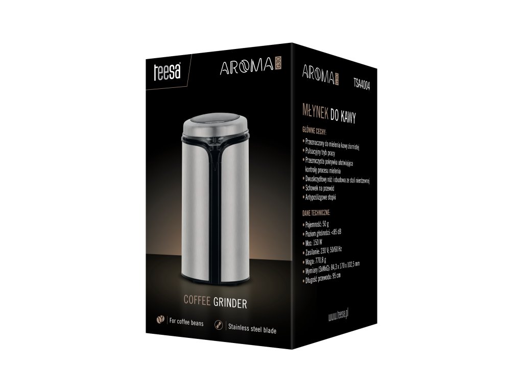 Každý den se okamžitě zlepší, když ho začneme šálkem aromatické kávy, zejména čerstvě mleté. Proto je dobré mít po ruce elektrický mlýnek Teesa AROMA G30, který díky motoru s výkonem 150 W a dvoukřídlové čepeli z nerezové oceli velmi přesně namele i ta nejtvrdší zrna.