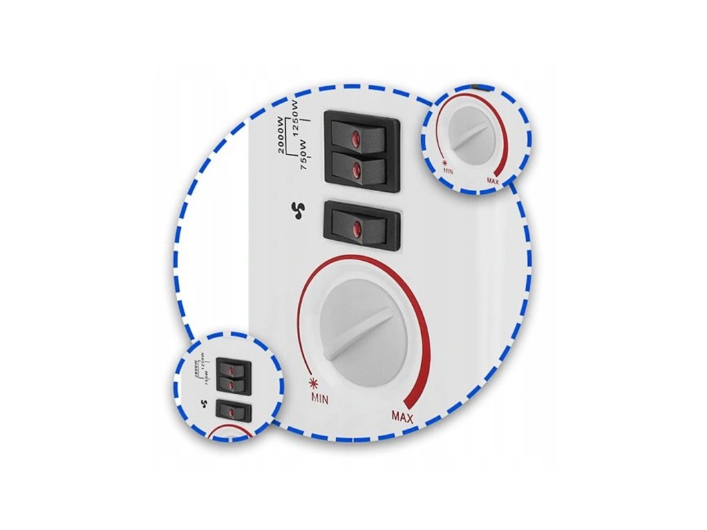 Max výkon 2000 W, 3 stupně výkonu 750/1250/2000W, dodatečný ventilátor, funkce TURBO, vestavěný termostat, regulace proudění vzduchu, ochrana proti přehřátí, kontrolka, velké ventilační otvory, mimořádně snadný a pohodlný na ovládání, pevná konstrukce a stabilní nožky,Max výkon 2000 W,