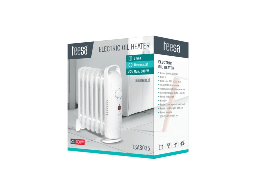 Díky olejovému radiátoru Teesa se 7 žebry o výkonu 800 W se během několika okamžiků ve vašem domě rozhostí příjemné teplo. Toto funkční zařízení je vybaveno nastavitelným termostatem a funkcí automatické kontroly teploty, což vám pomůže přizpůsobit podmínky v místnosti vašim potřebám.