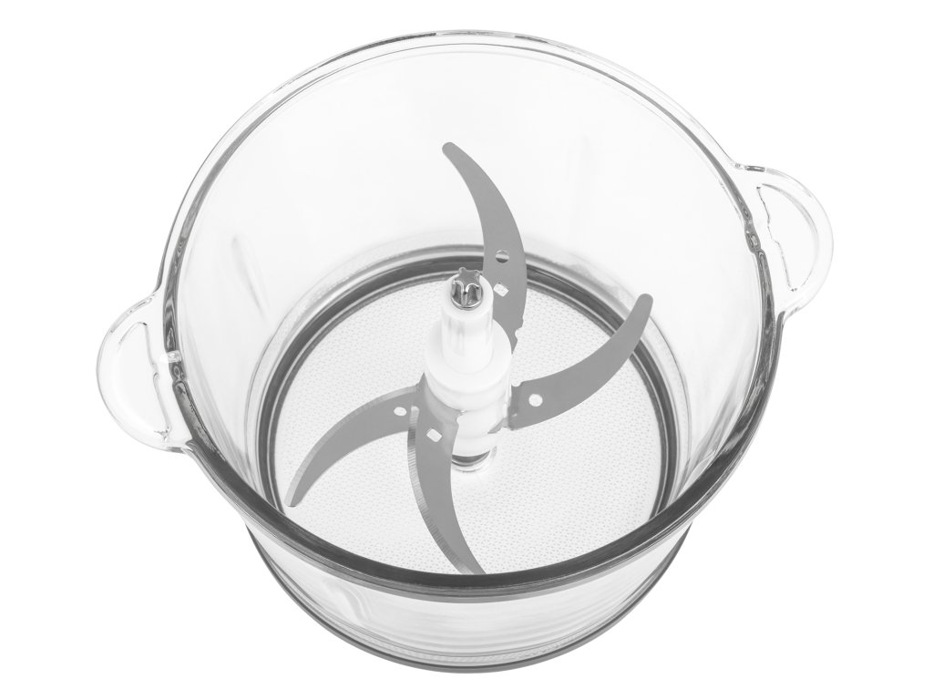 Sklenená misa s objemom 1,5 litra, ktorá je súčasťou súpravy, vám ešte viac uľahčí prácu, pretože vám umožní sekať veľké množstvo surovín naraz, a tiež stierka na ľahké vyberanie nasekaných potravín.