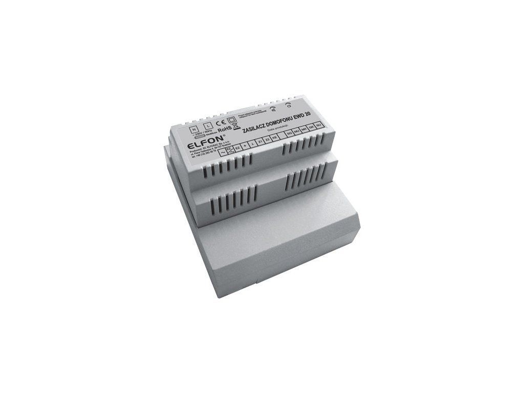 EWD-10/20 od firmy ELFON je napájecí zdroj určený pro analogové domofonní systémy s více uživateli. EWD-10/20 má kryt typu EURO spolu s rámem, který zakrývá elektrická spojení, což umožňuje bezpečné používání a pohodlnou instalaci na zeď. EWD-10/20 se vyznačuje vysokou zatížitelností 20VA. Díky své konstrukci může být napájecí zdroj namontován v elektrické skříni (rozvodné skříni) - DIN lišta 6 modulů.